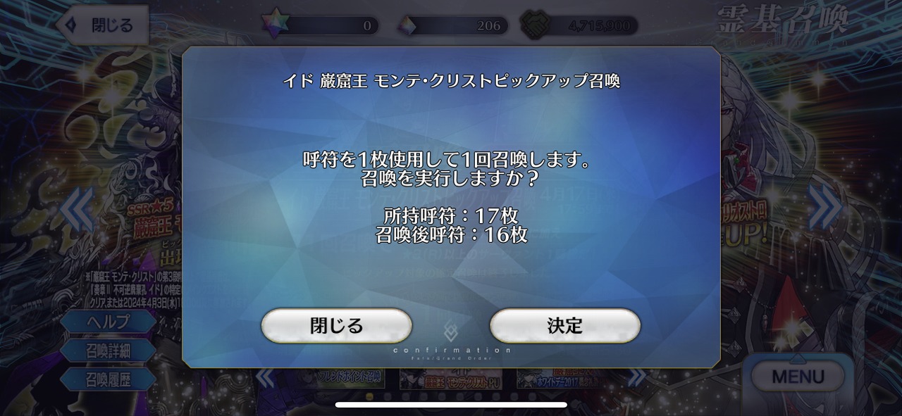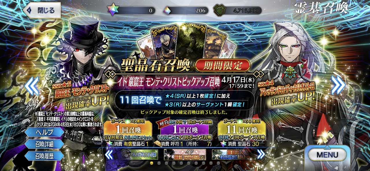 というわけで、イド巌窟王 モンテ・クリストピックアップ召喚を引いていくが、まずは軍資金二万円中一万円で突っ込んでいく。